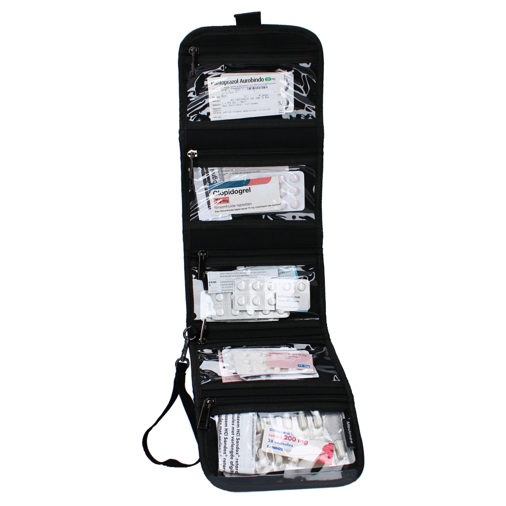 Práctica bolsa para medicamentos en blíster. Se enrolla en un pequeño paquete y puede cerrarse con un cierre elástico de velcro. Los medicamentos se guardan claramente en los 5 compartimentos transparentes con cremallera. En cada compartimento caben 2-3 tiras de pastillas, el envase y el prospecto. Incluye gancho para colgar, correa para la muñeca y tarjeta de identificación médica.