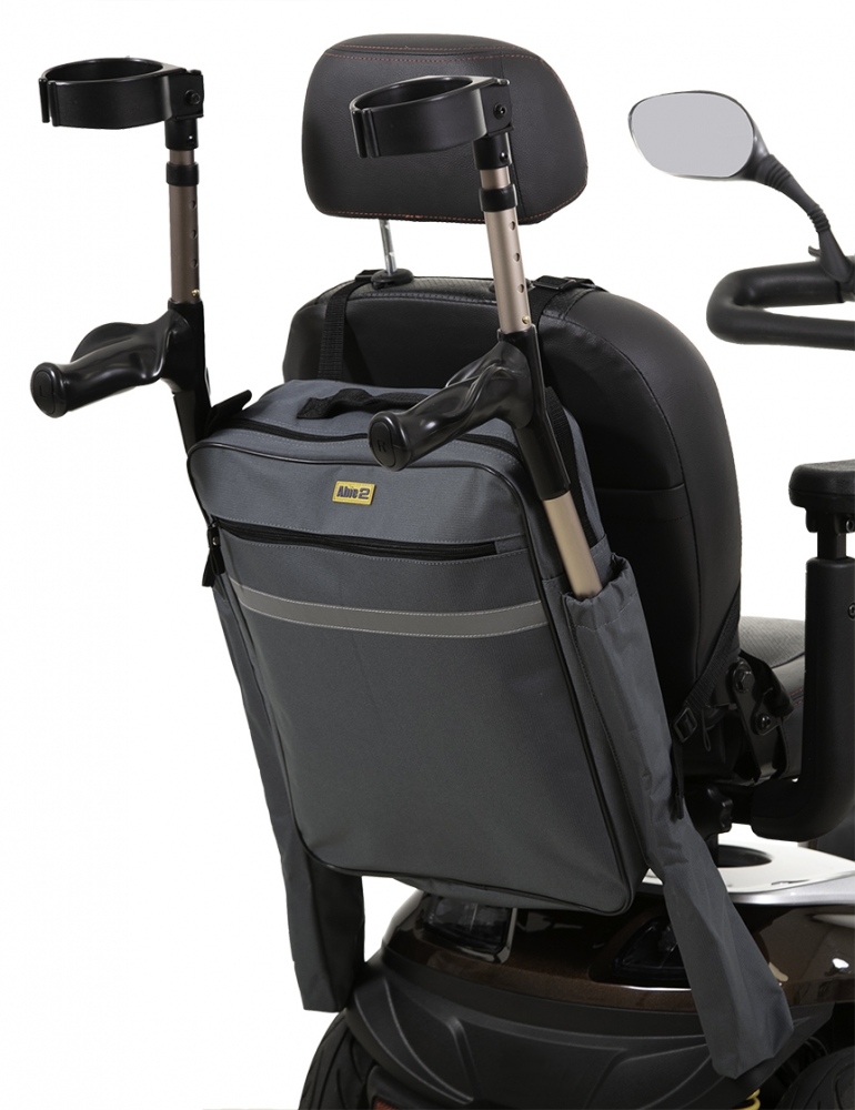 Bolsa duradera para silla de ruedas y scooter con a los lados soportes para muletas o bastón. Incluyen un gran compartimento y pequeño bolsillo frontal con cremallera. Banda reflectante.