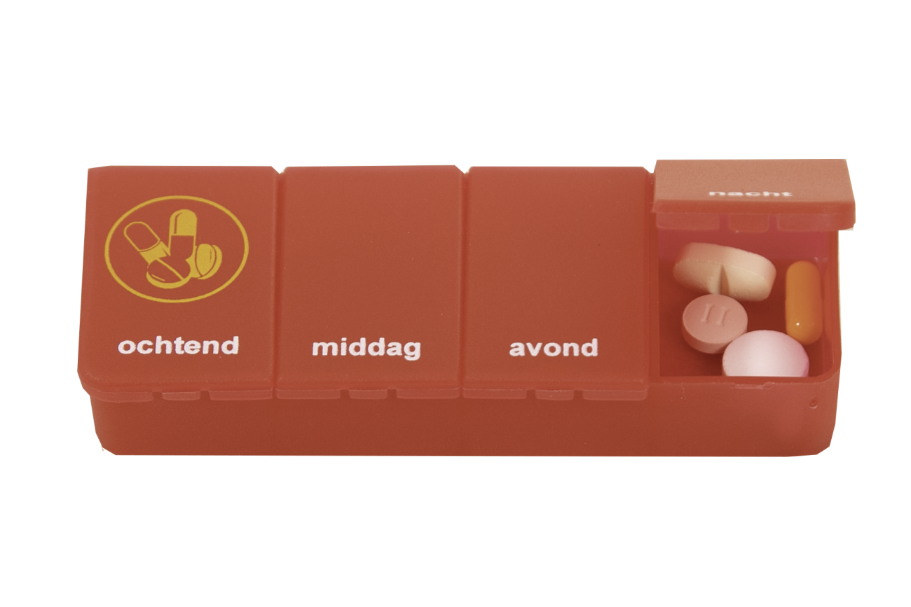 El pastillero de 1 día tiene cajas para diferentes horas del día, como la mañana, el medio día, la tarde y la noche. Hay 2 modelos diferentes: 4 compartimentos y 2 compartimentos. Disponible en dos colores: transparente azul y transparente rojo.