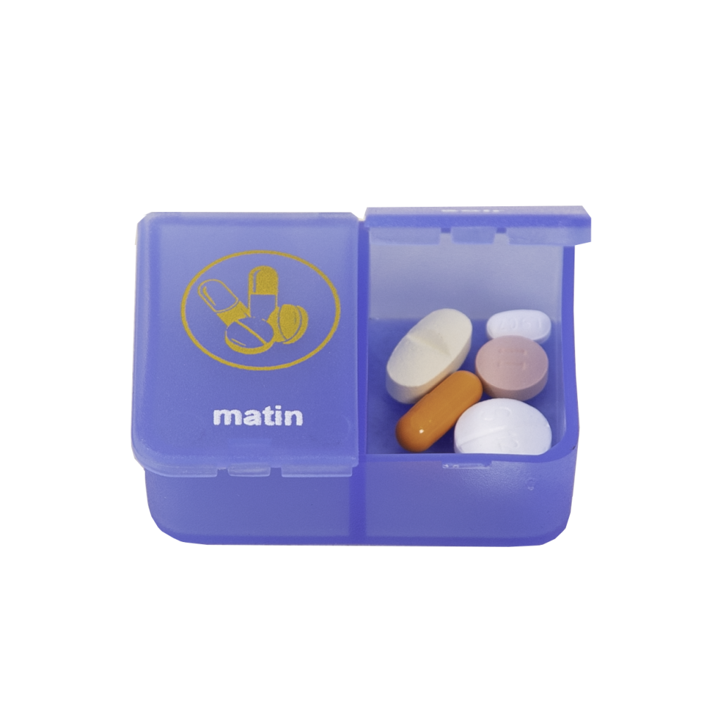 El pastillero de 1 día tiene cajas para diferentes horas del día, como la mañana, el medio día, la tarde y la noche. Hay 2 modelos diferentes: 4 compartimentos y 2 compartimentos. Disponible en dos colores: transparente azul y transparente rojo.